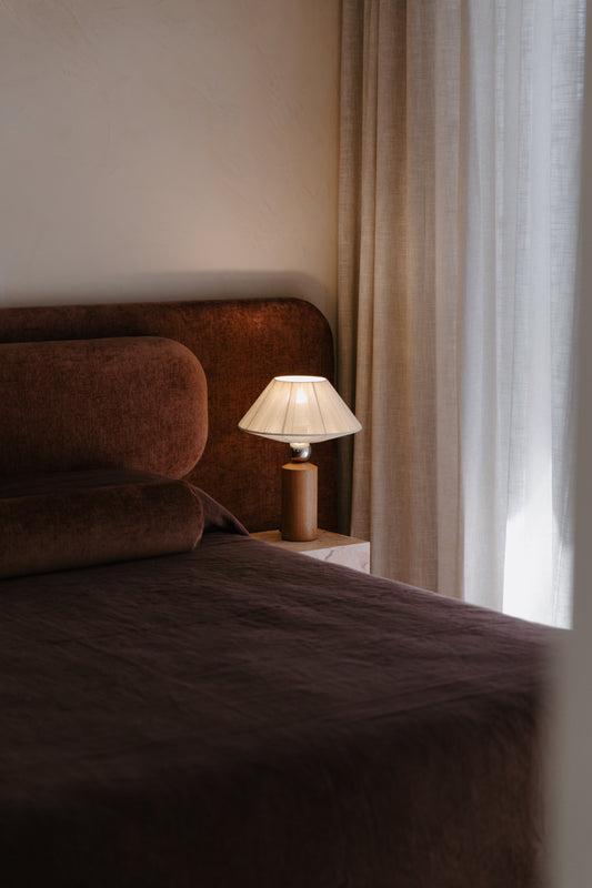 The Duke Lamp by Mcmullin reinterprets natural materials with a sculptural sensibility. Crafted from American Oak in a warm mid-tone finish, it is accented with a polished chrome sphere and crowned with a handwoven cotton rope shade. Harmoniously balanced in form and material, Duke casts a gentle, inviting glow—perfect for desks, side tables, or as a considered design statement. A marriage of function and artistry, it embodies modern living with effortless elegance.